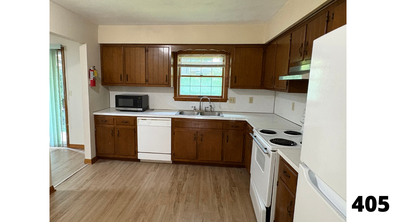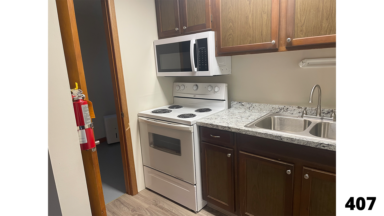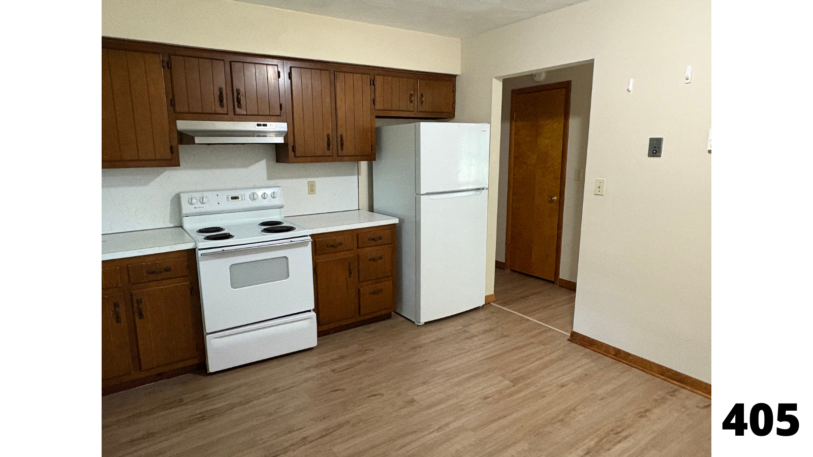 - Kitchen with range and refrigerator