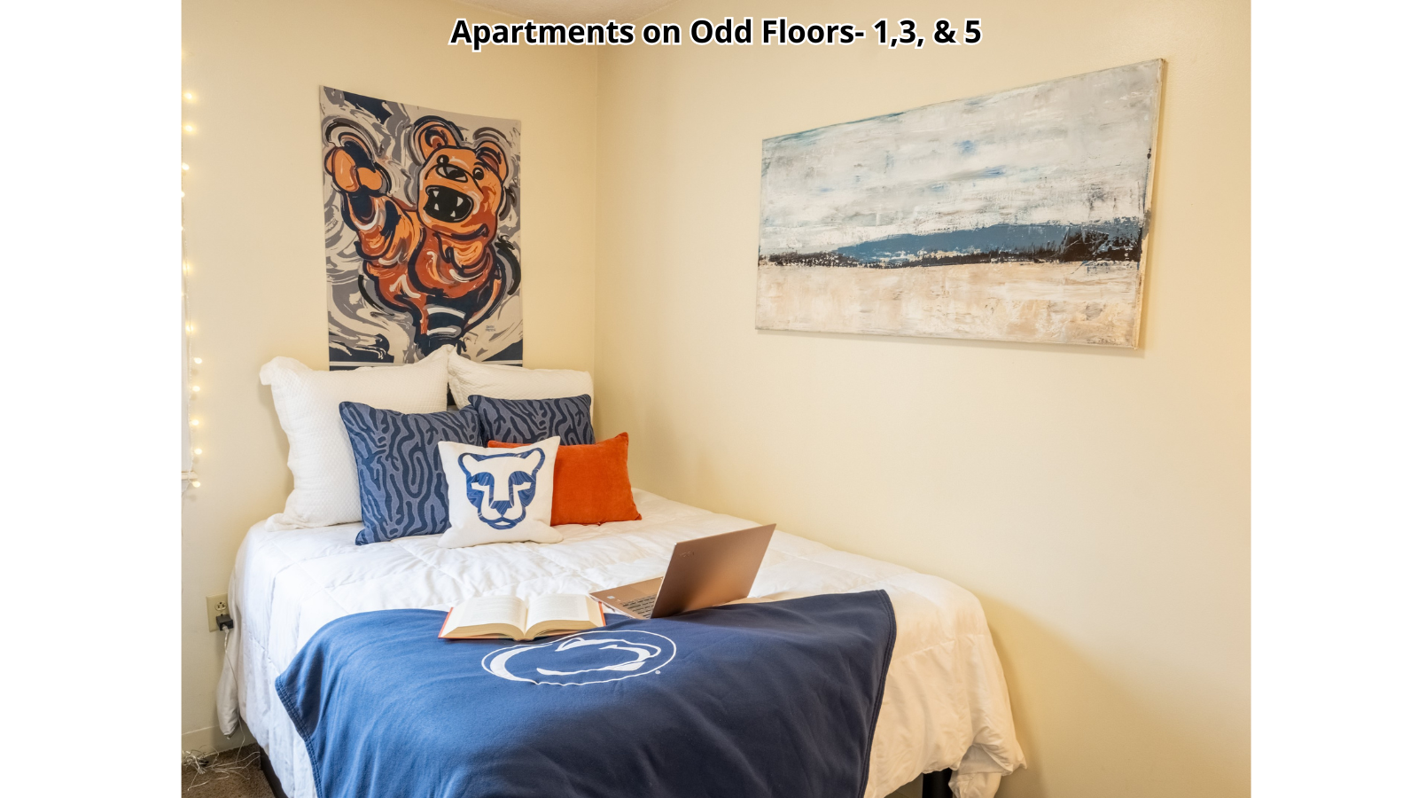 Bryce Jordan Tower is located just one block from campus and features three and four bedroom apartments with deluxe furnishings. Residents each have their own bedroom complete with full-size beds, built-in desks, and individual climate control. Additional amenities include on-site laundry, a fitness room, and covered parking spaces. All utilities are included in the rent.