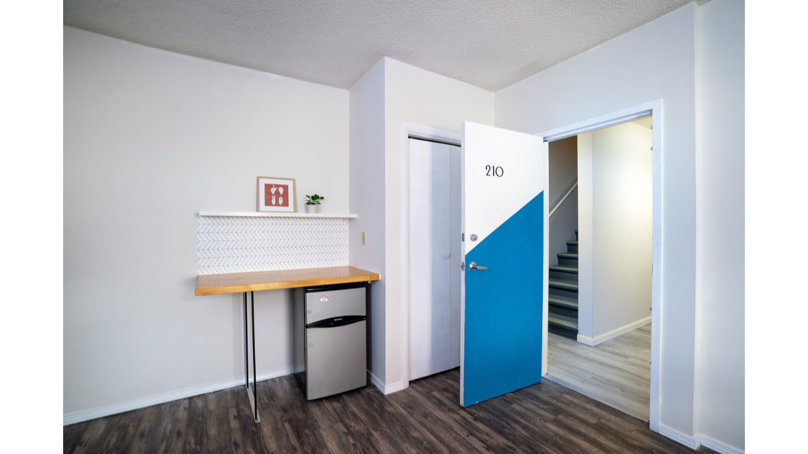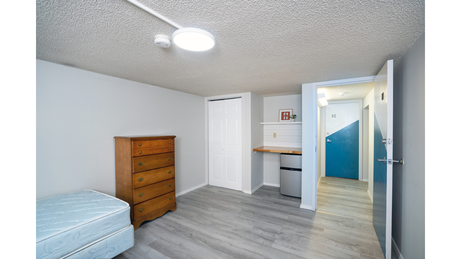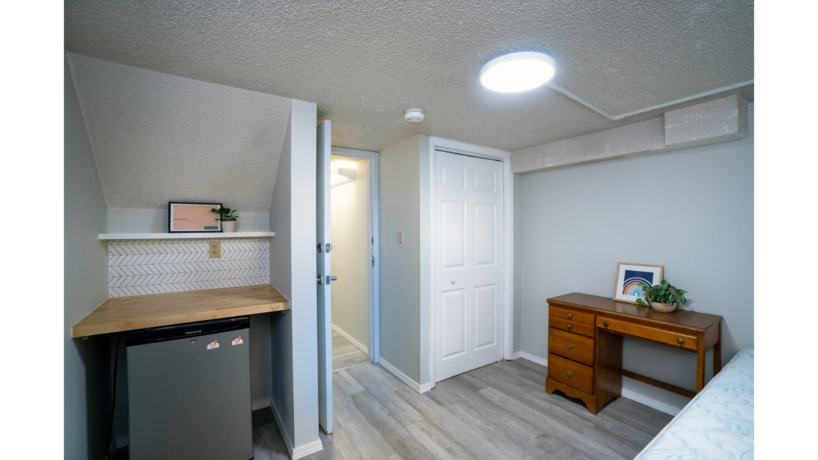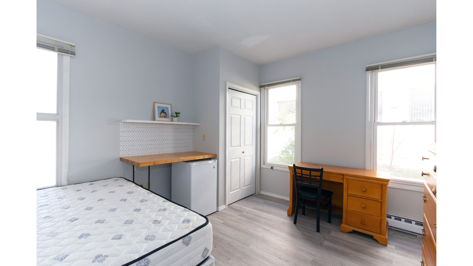 The Ivy Place rooming house offers furnished single rooms of various sizes and is located one and a half blocks from campus. This affordable alternative to dormitory living features seven shared full bathrooms, two half bathrooms, two common sinks for dish washing, on-site coin-operated laundry, on-site parking (additional fee), and includes most of utilities in the rent. Each room includes a bed, dresser, small refrigerator/freezer, microwave, built-in shelving, and closet. Larger rooms also include a desk and chair.